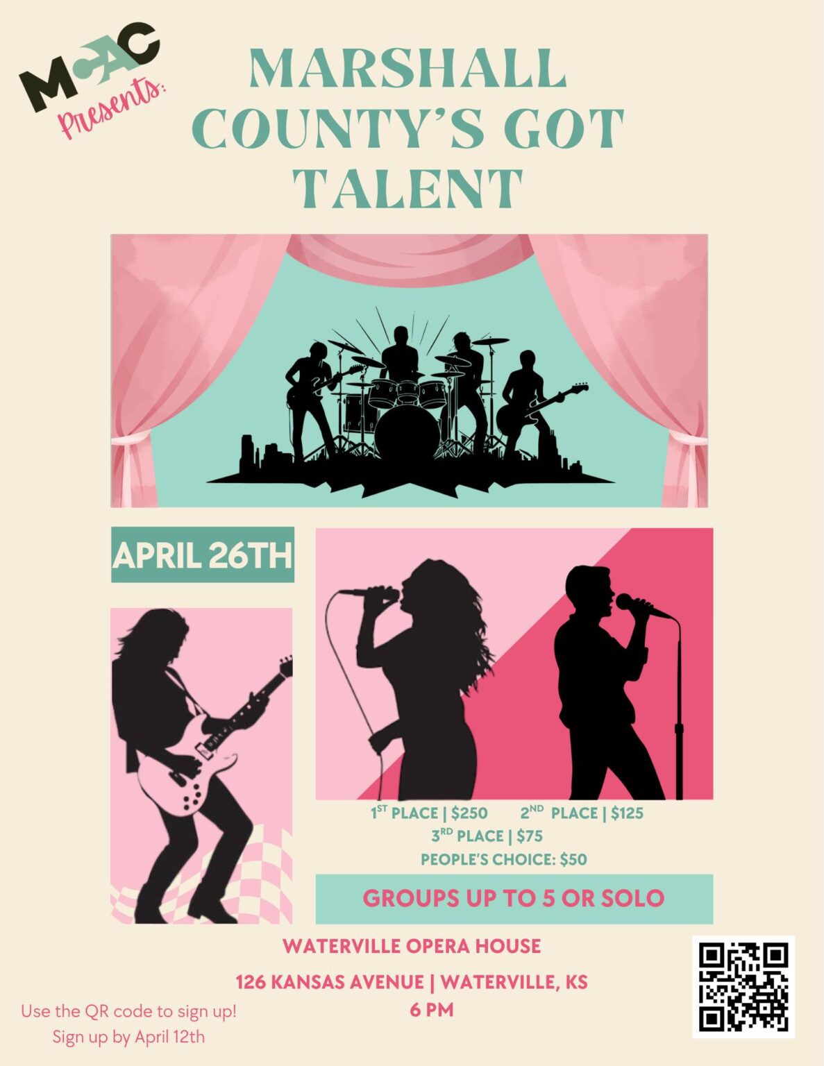 “Marshall County’s Got Talent” is Sunday, April 26, at 6 p.m. at the Waterville Opera House. Students from Marysville High School and Valley Heights High School will perform vocal music, instrumental selections and dramatic interpretation in a program that shows the range of talent in this county.